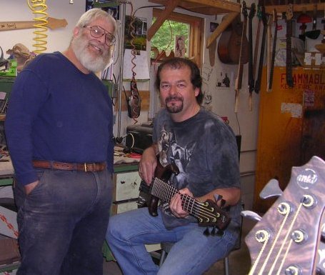 Photo by Jean Bremy I met world famous luthier Michael Tobias of MTD (Michael Tobias Design) through our mutual friend, Tim Bogert of Vanilla Fudge. I had always admired Mike's work, and when Mike offered to spec out a bass to fit me, I was thrilled. This photo was taken the day the bass was "born", in June 2005. See a better photo of the bass back in the gallery. |