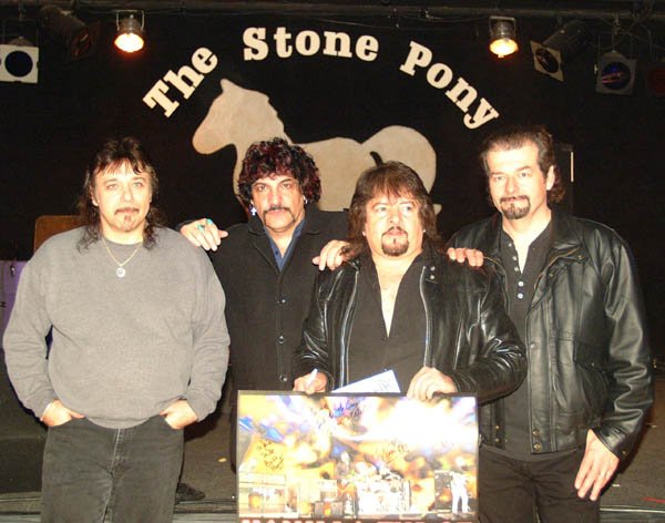 With Vanilla Fudge ... after the show, January 26, 2002 at the famous Stone Pony in Asbury Park, New Jersey, the stomping grounds of "The Boss", Bruce Springsteen. Coincidentally, E Street Band drummer Max Weinberg was on hand for the show, and stopped by back stage to say hello to his friend, Carmine Appice! Bill Pascali, Carmine Appice, Vince Martell, Pete Bremy |